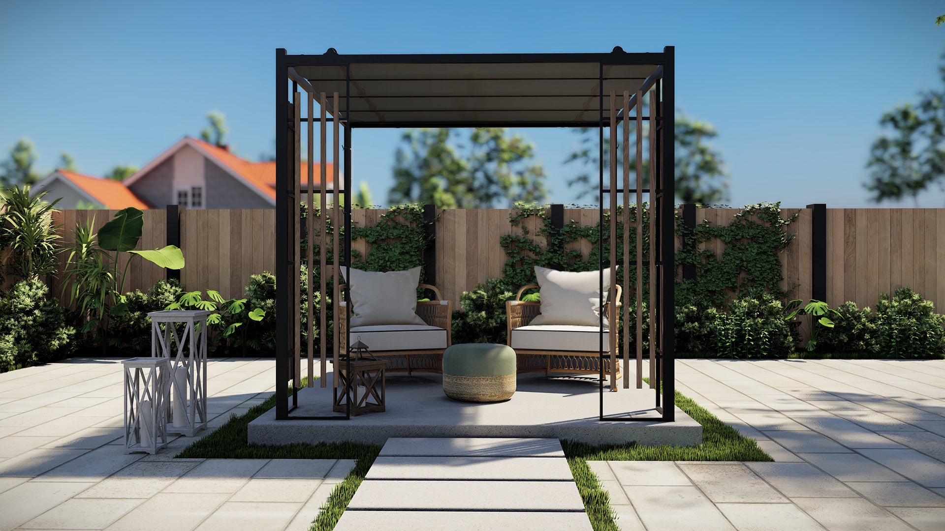 MOD’s soft-top canopies provide a wonderful sunshade. Keep in mind they’re water-resistant, not waterproof. For longevity, consider removing the canopy during bad weather or when the pergola is not in use for an extended period. This simple practice helps preserve your pergola and avoids the need for replacement parts or a new unit. The canopy can easily be detached and separated for washing and cleaning.